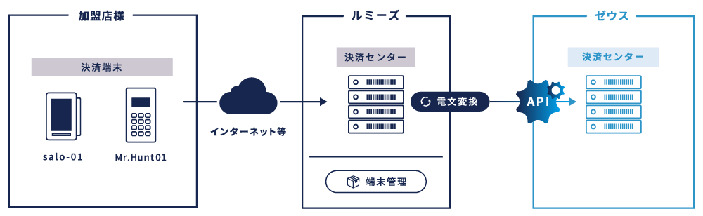 ルミーズとゼウスの決済センター間を接続することで、ゼウスは「Mr.Hunt01」専用アプリ、POSシステムとの連携アプリ、決済端末の配送管理を行う決済端末管理システム(TMS)について、開発が不要となり、インフラ整備にかかるコスト・期間の圧縮を実現することができました。決済端末に関するセキュリティもルミーズによって担保されており、故障対応も含めた端末管理コストを大幅に削減。サービス展開に必須となる決済端末のブランド認定試験においても、各社とのさまざまな調整事項をルミーズがサポートすることで認定取得の負担を軽減し、対面決済サービスの拡充を容易にしています。